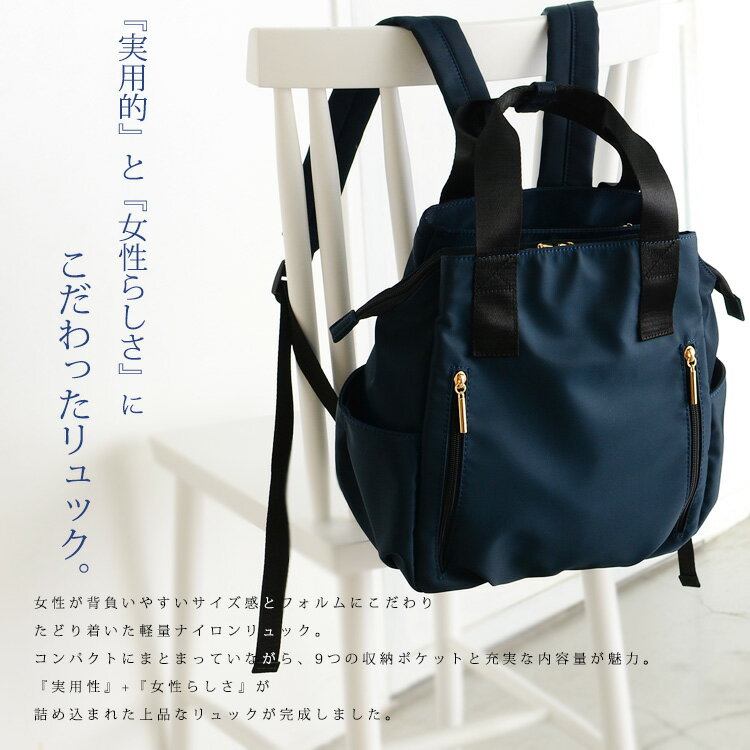 また、コンパクトにまとまっていながら、9つの収納ポケットがある大容量が魅力のレディースリュックサックです。