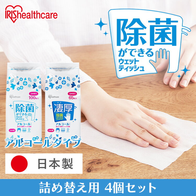 ウェットティッシュ 凄厚 アルコール詰め替え 4個セット WTT-65A4 WTT-100A4 ウェットティッシュ アルコール エタノール 除菌 除菌シート 厚手 厚め 厚み 日本製 国産 詰め替え 詰替 65枚入り 100枚入り 4個 セット アイリスオーヤマ