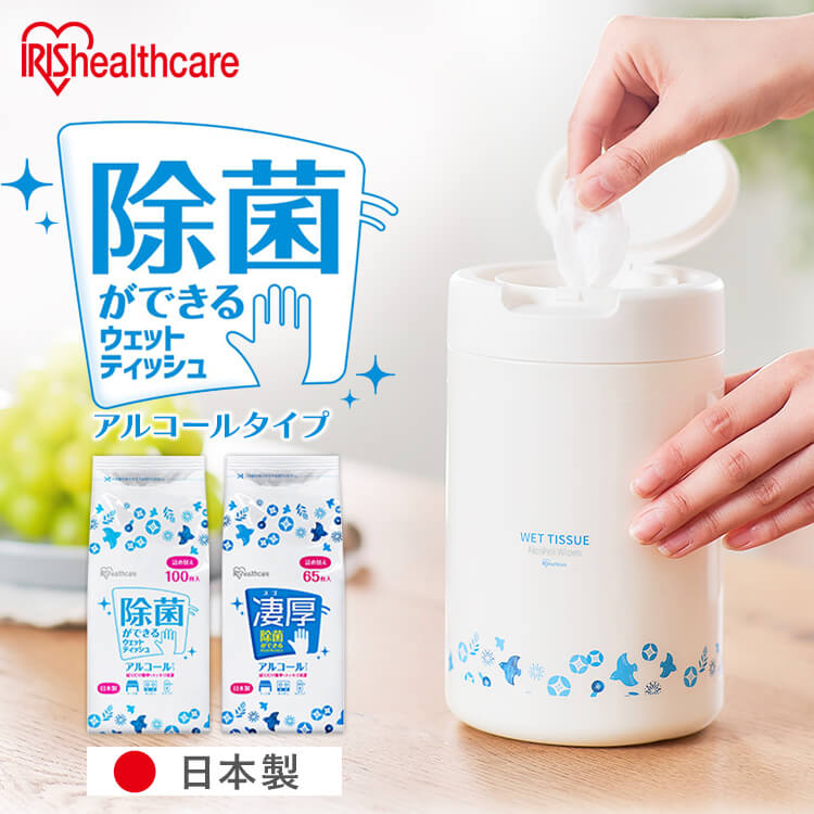 除菌ができるウェットティッシュ アルコール [日本製]レギュラー/大容量100枚入り厚手/65枚入り 【気になる場所をサッと一拭き!】 お食事前に、手すり・ドアノブに、ふきん代わりに、ホコリ・汚れに。