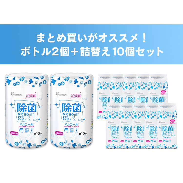 ウェットティッシュ 除菌 アルコール セット(ボトル2個・詰替え10個) WT100A WT65A レギュラー 厚手送料無料 厚手 本体 エタノール 除菌 除菌シート 日本製 国産 ボトル 容器 ケース 100枚入り 詰替え 詰替 ウエットティッシュ アイリスオーヤマ iris04