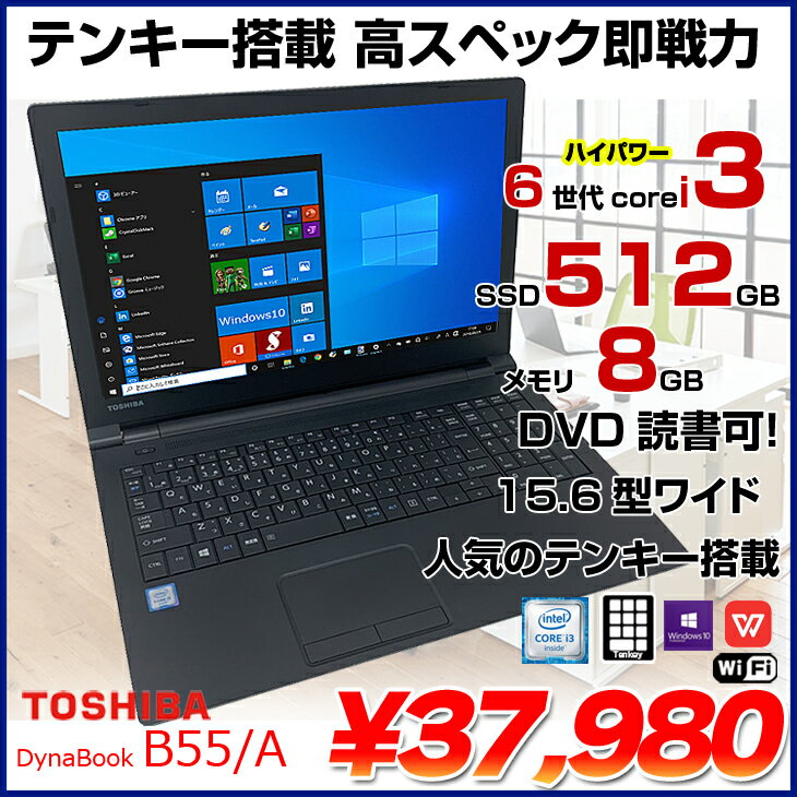 【中古】東芝 dynabook B55/A 中古 ノート Office Win10 第6世代[Core i3 6100U 8GB SSD512GB マルチ 無線 テンキー 15.6型] :良品
