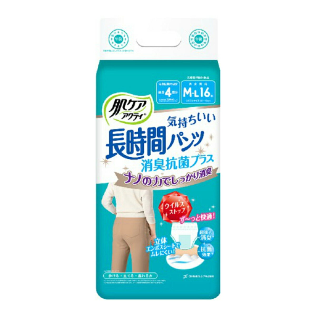 【送料込・まとめ買い×4個セット】日本製紙 クレシア 肌ケア アクティ 長時間 パンツ 消臭 抗菌 プラス M-L 16枚