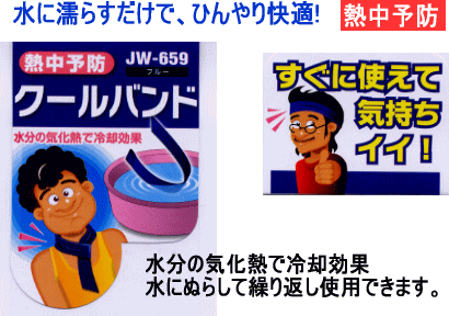 ひんやり快適! クールバンド JW-659 水に濡らすだけで、ひんやり快適 熱中予防 水分の気化熱で冷却効果 水分の気化する吸熱作用で熱を奪い、皮膚の温度上昇を抑えます。
