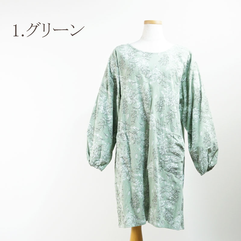 かわいい ボタニカル 割烹着 部屋着 ルームウェア ワッシャー キッチン エプロン 綿100% ナチュラル ゆったり おしゃれ ピンク ブルー グリーン フリーサイズ 春夏 オールシーズン かっぽう着 M L シンプル 料理教室 メール便対応 ワンマイルウェア