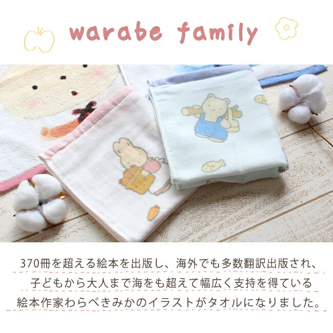 370冊を超える絵本を出版し、海外でも多数翻訳出版され、 子どもから大人まで海をも超えて幅広く支持を得ている絵本作家わらべきみかの イラストがタオルになりました。