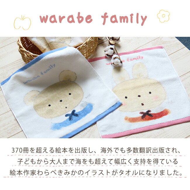 ------ 商品仕様 内容 わらべファミリー ウォッシュタオル 2枚セット サイズ 約34×35cm カラー 2色展開 ビッグフェイス:ブルー・ピンク 組成 綿100% 生産国 日本製 備考 370冊を超える絵本を出版し、海外でも多数翻訳出版され、 子どもから大人まで海をも超えて幅広く支持を得ている絵本作家わらべきみかの イラストがタオルになりました。